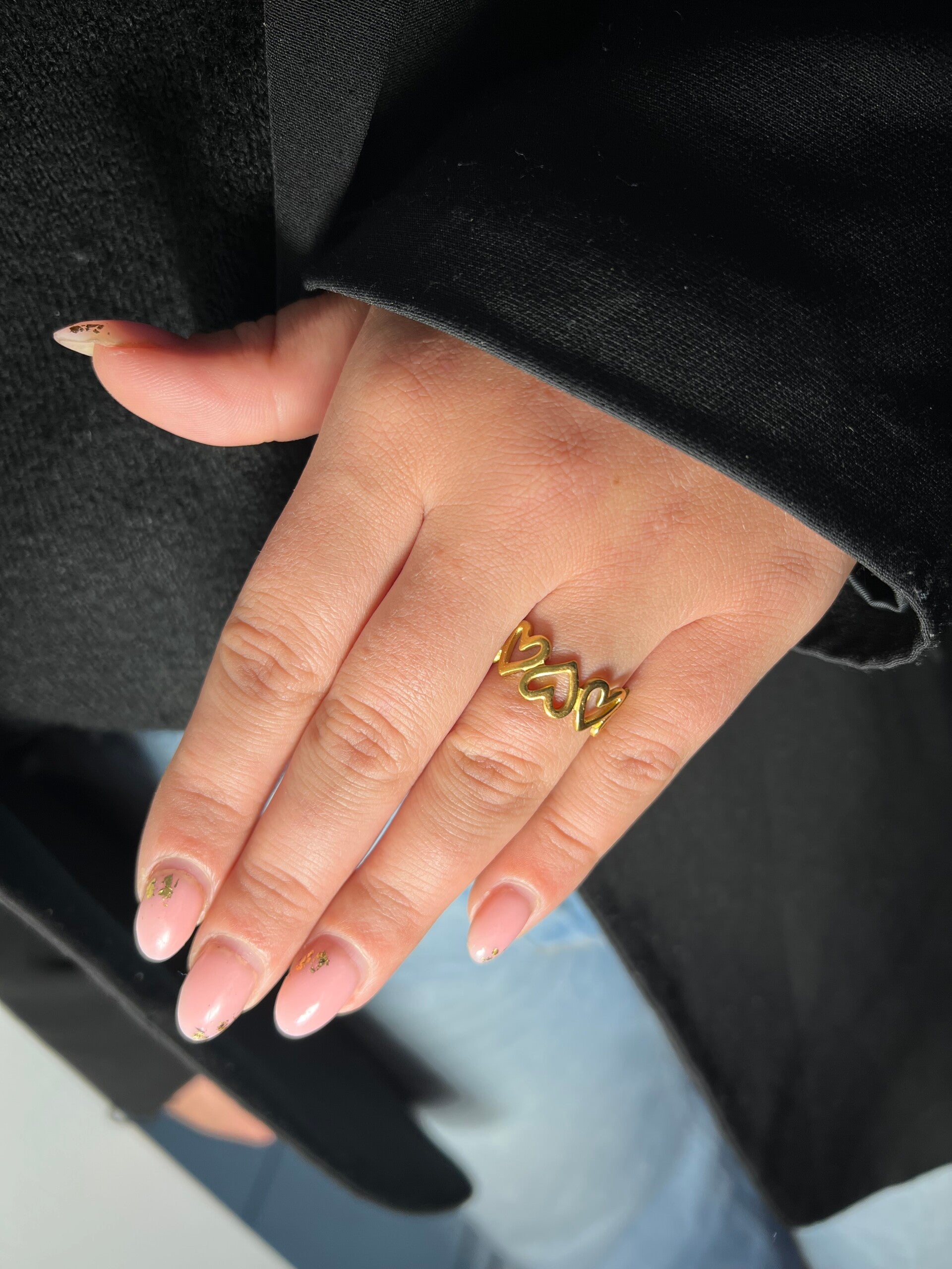 Op zoek naar een tijdloze en stijlvolle toevoeging aan je sieradencollectie? Dan is deze prachtige gouden hartjes ring precies wat je nodig hebt! Gemaakt van hoogwaardig stainless steel, is deze ring niet alleen duurzaam maar ook hypoallergeen. Met zijn elegante ontwerp en glanzende afwerking is deze ring perfect voor elke gelegenheid. Maak een statement en straal met deze eye-catching ring om je vinger